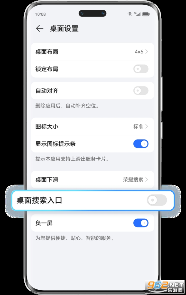 在设置>桌面和个性化>桌面设置>桌面搜索入口中关闭开关后,在手机桌面上将不会显示荣耀搜索入口。