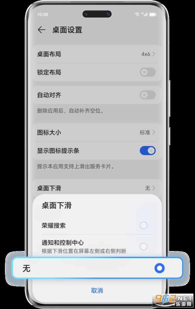 同样进入设置>桌面和个性化>桌面设置页面,点击桌面下滑选择无或通知和控制中心后,再次下拉桌面将不会进入搜索页面。