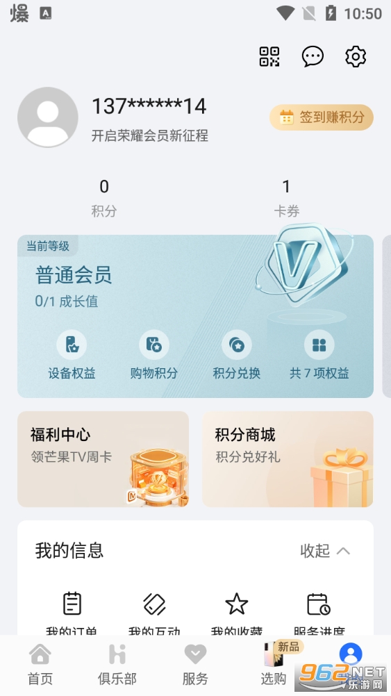 4、点击我的,可以查看设备权益、购物积分、积分兑换等权益,还可以查看订单、互动、收藏等;