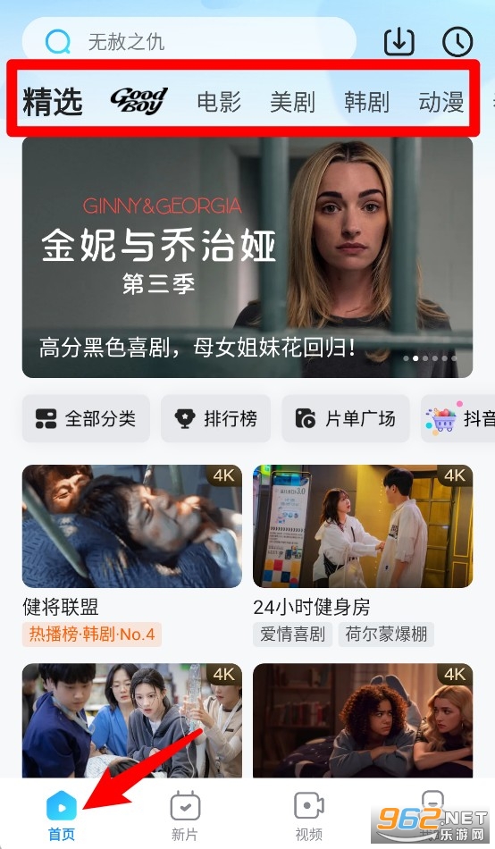 1、点击首页选项,可浏览推荐影视内容,并通过顶部标签快速切换电影、美剧、韩剧、动漫等不同分类。