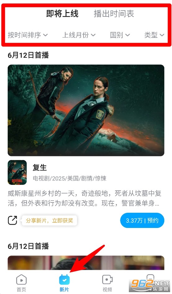 2、进入“新片”页面后可查看即将上线的影片,支持按时间、类型、国家等条件筛选内容。
