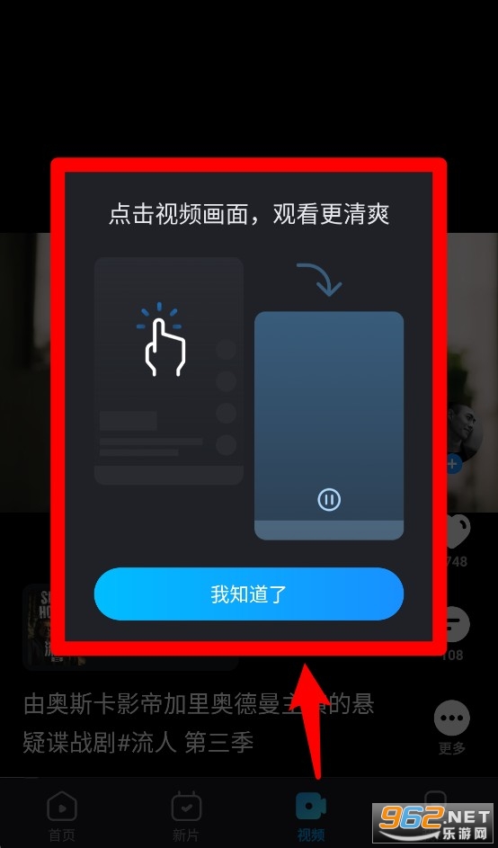 4、首次进入视频播放界面时,会弹出提示窗说明如何点击视频画面获得更清晰的观影体验。