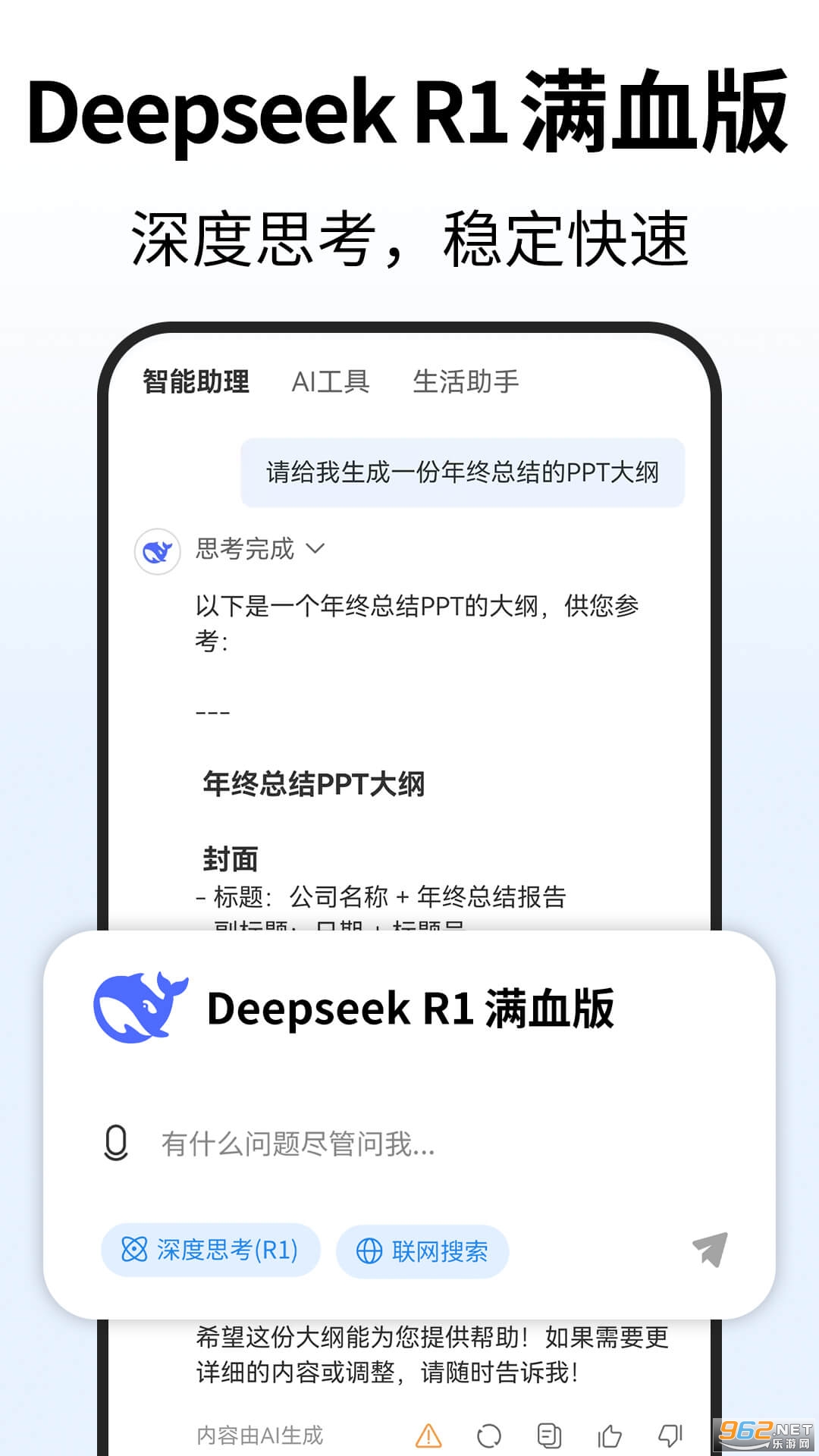 专业级创作能力:采用满血版R1推理模型,AI绘图质量媲美专业写真,PPT生成自带科技感动态效果,满足高精度内容输出需求。