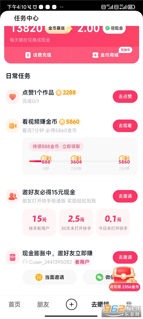 App内"任务"或"去赚钱"页面会列出每日任务。
