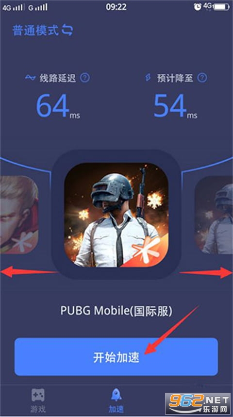 5、左右滑动选择刚刚添加的游戏,点击开始加速。