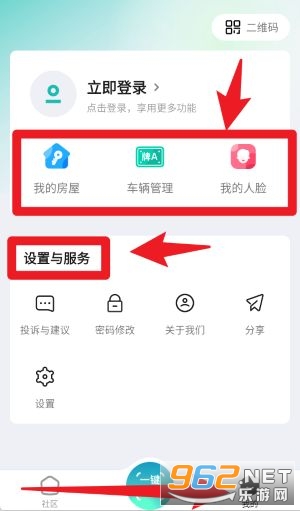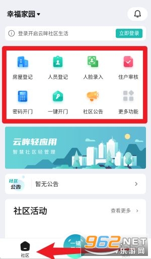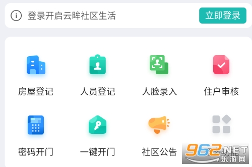 2、进入“社区”首页后可查看房屋登记、人员登记、人脸录入、一键开门等多个常用功能模块,操作便捷高效。