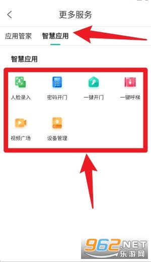 4、在“智慧应用”栏目中可使用视频广场、设备管理、人脸识别开门等智能服务,提升社区智能化便捷体验。