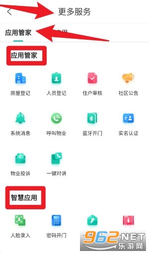 3、点击“更多服务”进入“应用管家”,可查看所有社区功能应用,涵盖社区公告、物业报修、门禁管理等服务。