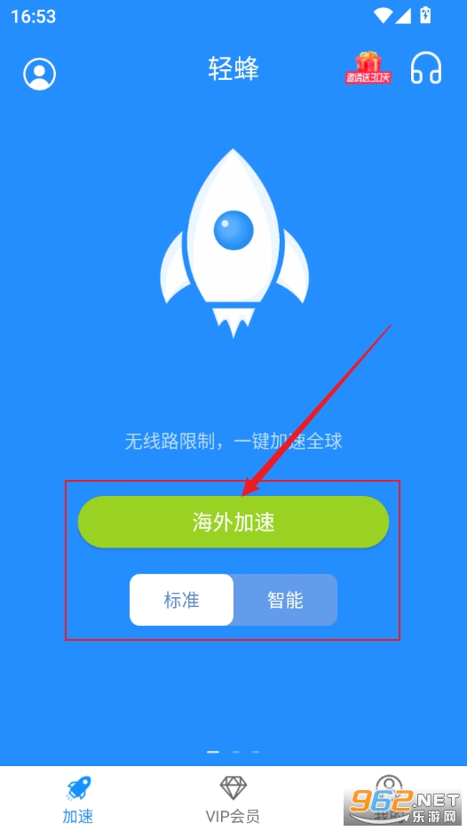 2、点击首页海外加速即可,也可以选择标准或者智能加速