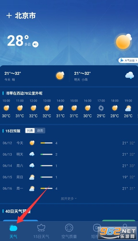 3、进入天气预报界面,即可查看当地实时天气状况和未来几天的气候变化趋势。