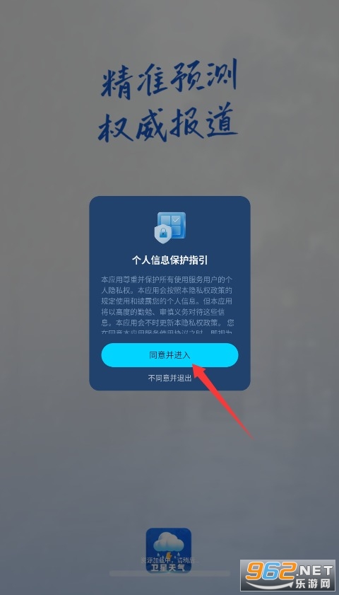 1、启动卫星准报天气APP,仔细阅读用户协议与隐私条款后,点击同意并进入按钮进入。