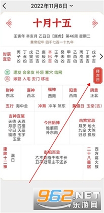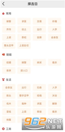 首页功能栏中点选“择吉日”,可以按照个人计划和用途(如搬家、开业、出行等)进行择日设置。