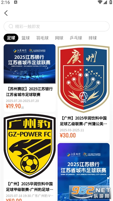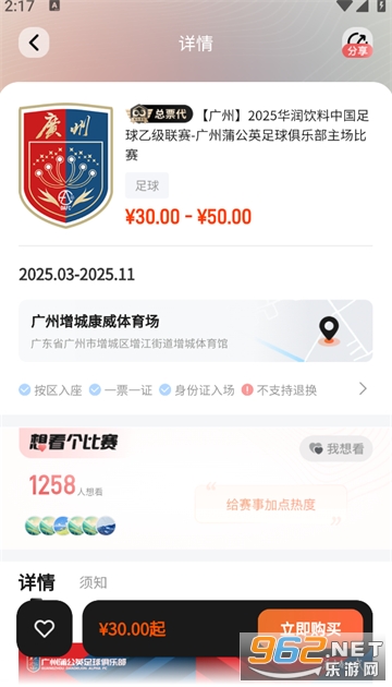 《看个比赛》是体育行业极具影响力的移动互联网体育现场消费平台。专为球迷打造便捷赛事购票工具,业务覆盖国内外各类体育活动,涵盖数字化票务、体育培训等四大细分领域。球迷能在 APP 上找到全面精彩赛事并直接购票,回归赛场为球队助威。