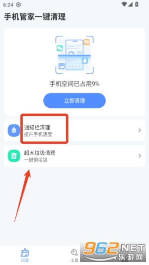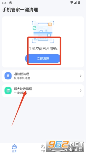 1、下载手机管家一键清理app并打开,在主界面点击一键清理按钮,快速清除手机缓存和垃圾文件。