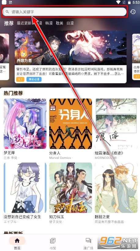 1.打开喵呜漫画,点击首页上方的搜索框。