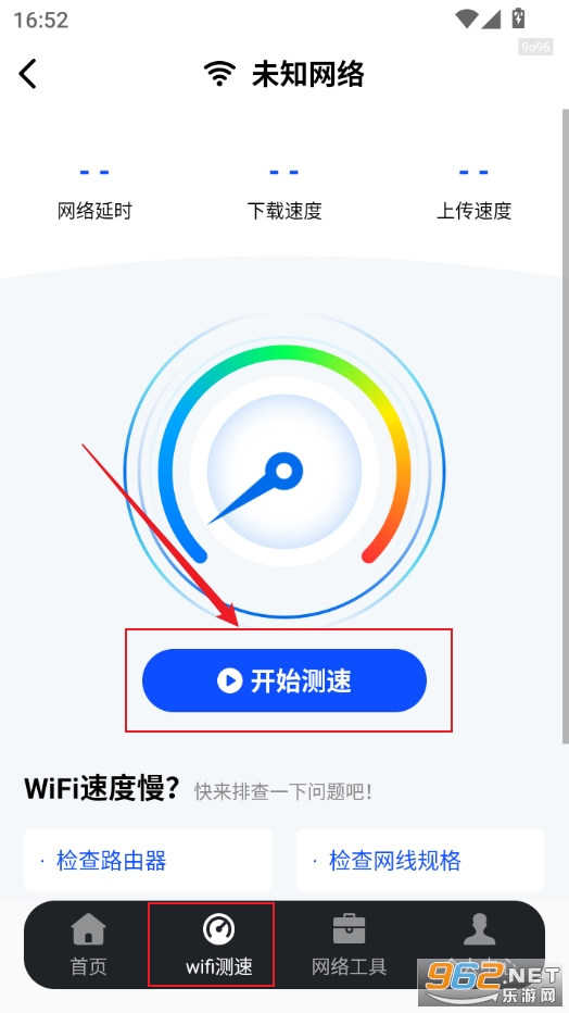 2、点击下方wifi测速,点开始测速,等待测速完成即可