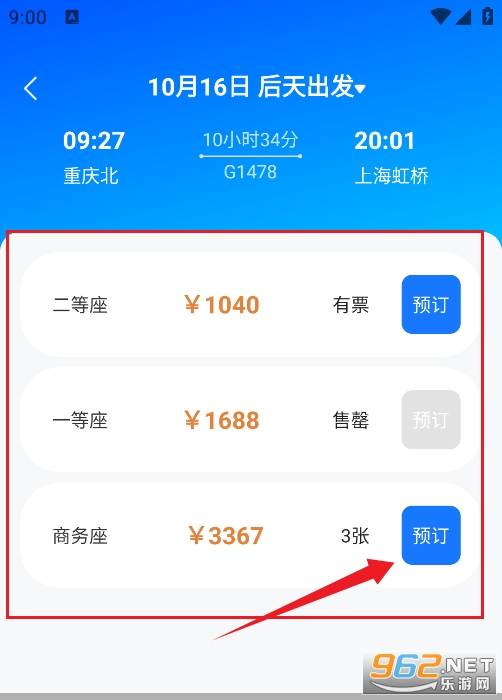 6、根据自己的需要选择座位等级,然后点击右侧的【预订】按钮进行后续的订票服务。