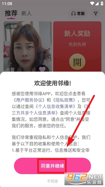 1、安装并打开邻缘,在欢迎使用邻缘!提示界面点击同意并继续。