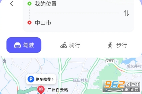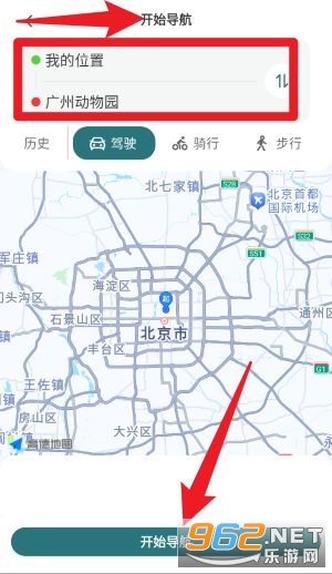 4、选择起点与终点后点击“开始导航”即可进入地图引导界面,支持多种出行方式如驾车、骑行与步行导航。