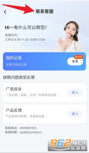 2、点击“联系客服”页面可获取客服联系方式及工作时间,并可根据问题类型选择广告投诉或产品反馈入口。