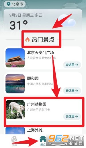 3、在“景点”栏目下可查看当前城市的热门景点推荐,点击景点名称旁的“去这里”按钮即可发起导航。