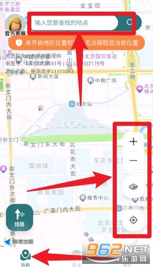 1、进入首页导航界面后,可在上方输入框内搜索地点,并通过右侧按钮进行地图缩放、图层切换与定位设置。