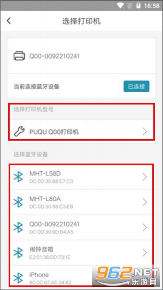 2、根据提示开启蓝牙功能,选择打印机型号,搜索打印机设备进行连接,成功连接时会显示“已连接”。