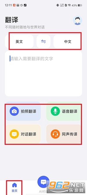 1、支持拍照翻译、语音翻译、实时对话翻译及同声传译功能。用户可直接输入文本或选择翻译语言,一键完成翻译需求。