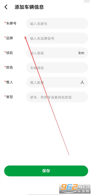 2.之后在添加车辆信息页面中直接输入车牌号、品牌、续航、颜色和类型等信息之后点击保存即可。