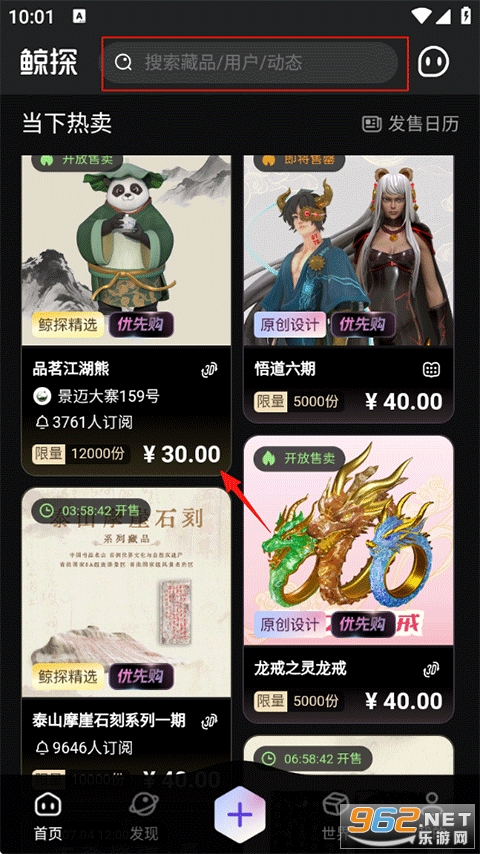 1、打开鲸探APP,在首页搜索你想要的数字藏品,点击进入详情页;
