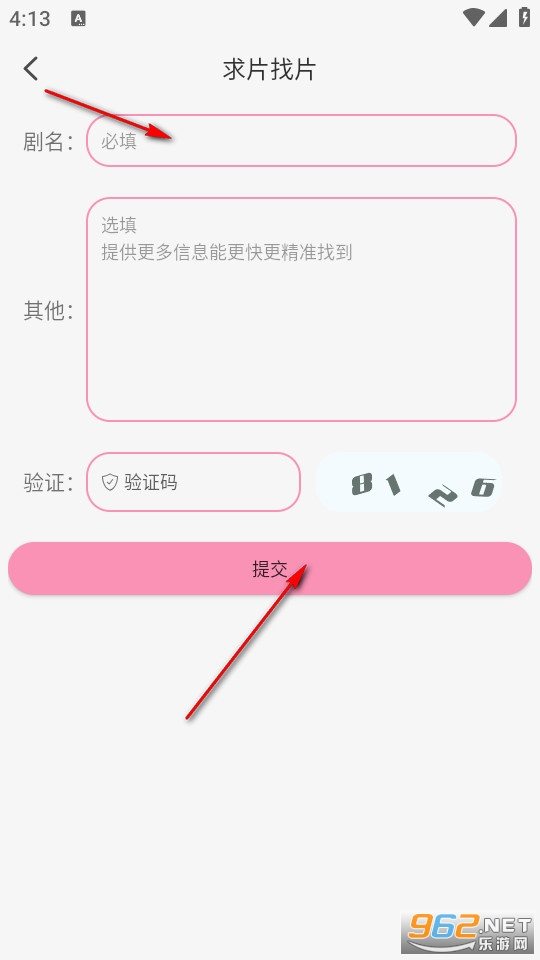 然后我们在求片找片中填写剧名,进行描述,输入验证码进行提交。