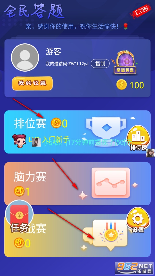 我们进入软件主页,可以依据自己的喜好选择三个不一样的游戏玩法,排位赛什么方面的答题知识都有,新入手的用户可以先点击脑力赛了解答题题目。