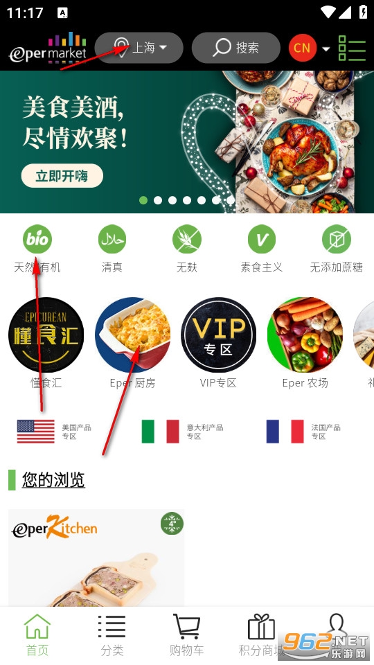 我们首先进入主页,我们在上方可以修改我们的所在城市和地址,下方则能够根据你的需求来进行选择,我们可以选择健康生活或者是有所忌口便可以选择天然有机或者清真食品,如果希望找精品商品就能够往下寻找。