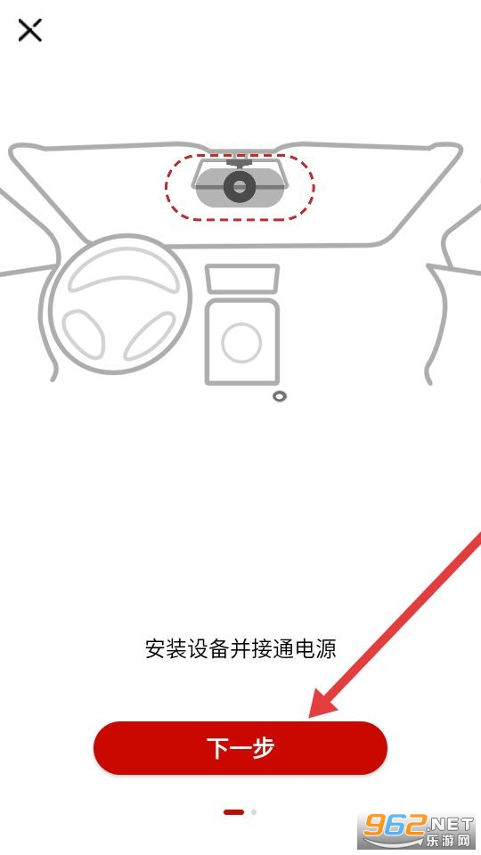 2、设备安装指引页以图示标注设备安装位置,提示安装并接通电源,底部红色下一步按钮突出,帮助用户按步骤推进设备初始化设置。