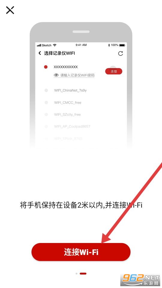 3、WiFi连接页面提示手机保持在设备2米范围内,展示WiFi列表界面,底部红色连接WiFi按钮显眼,引导用户完成设备网络连接步骤。
