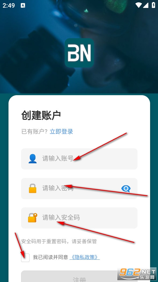 然后输入自己的账号密码已经安全码,然后同意协议点击注册。