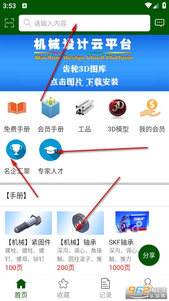 点击软件进入首页,我们能够在首页上方搜索自己想要搜索的内容,我们也可以在首页了解名企与领域出名的专家,我们也可以直接开始寻找机械零件开始学习。