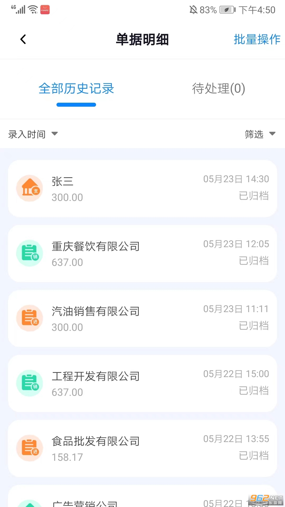 2、进入单据明细界面,可看到全部历史记录,