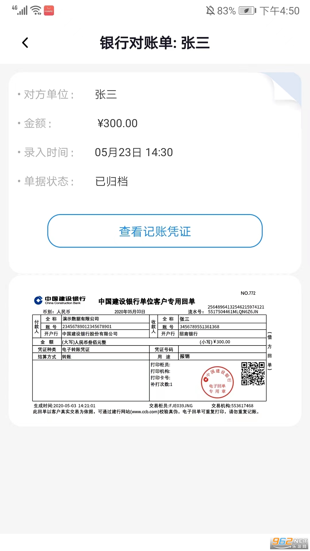 3、选择相应的记录可看到单位、金额、录入时间、单据状态和记账凭证等详细信息,