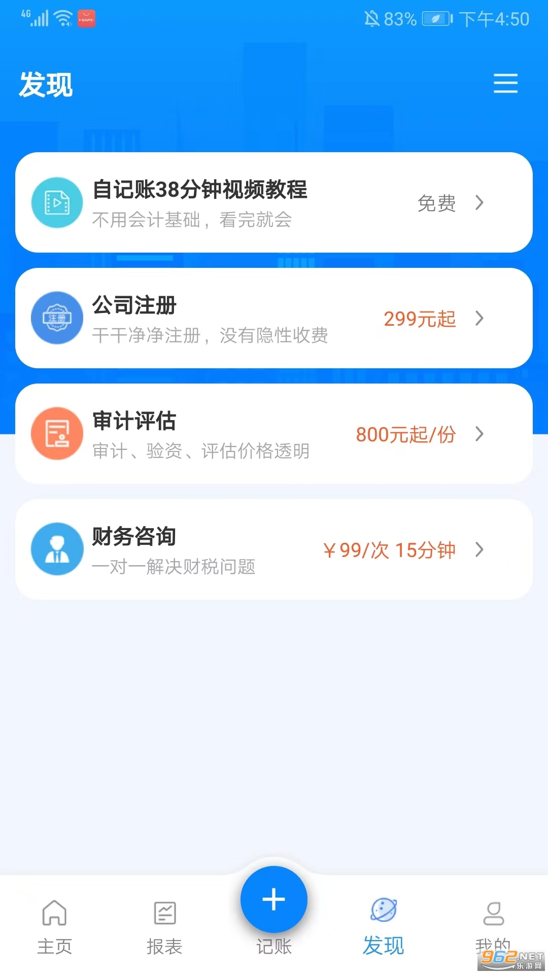 6、进入发现界面,还有视频教程、公司注册、审计评估、财务咨询等功能选项,