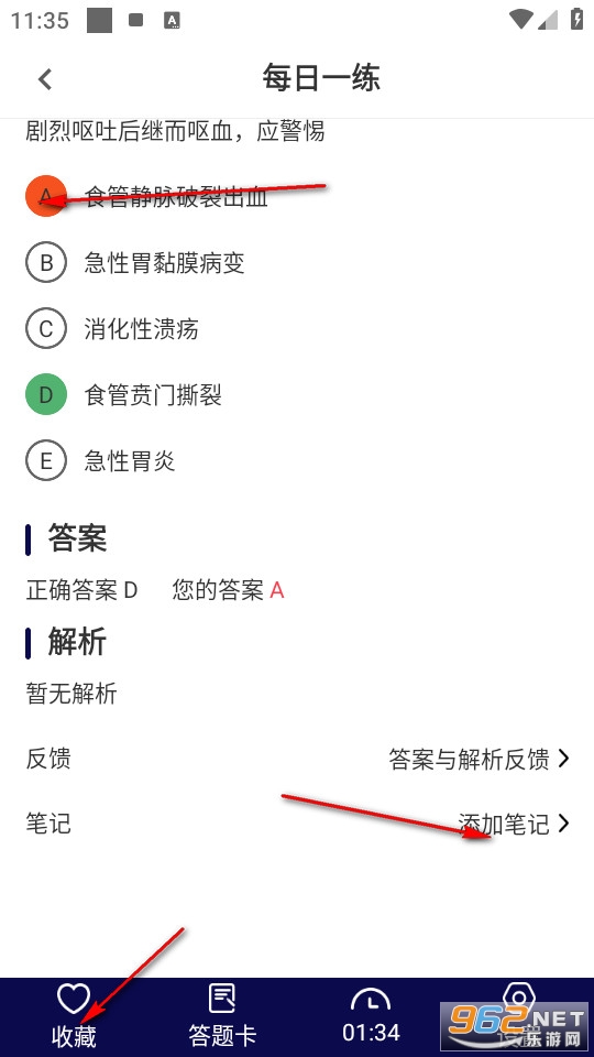 当我们题目选错时,想要将该错题记下,我们可以选择记笔记或者收藏该题。