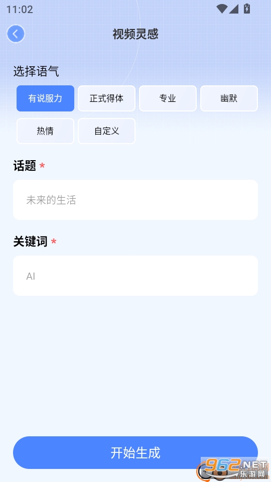 5.然后大家选择语气、输入话题和关键词后,点击“开始生成”按钮进入下一步