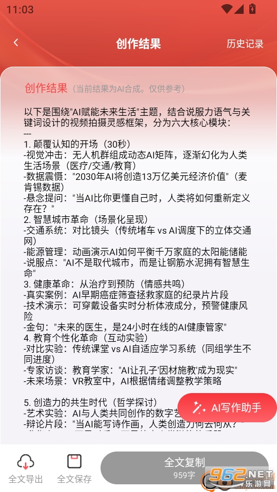6.之后大家就可以获取AI创作结果了,点击“全文导出”就可以保存了