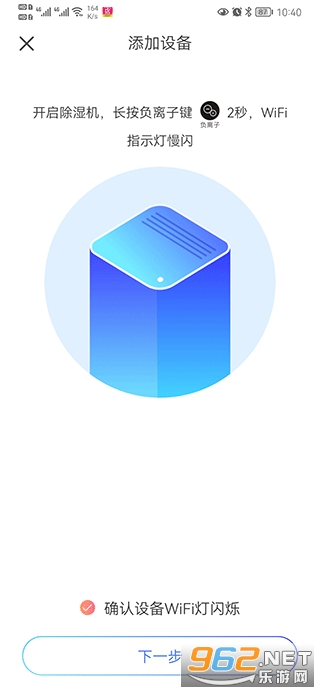 三、按照提示开启除湿机,确认设备WiFi灯闪烁后,点击下一步