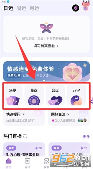 2、进入首页选择塔罗或星盘等功能板块,进入相应页面。