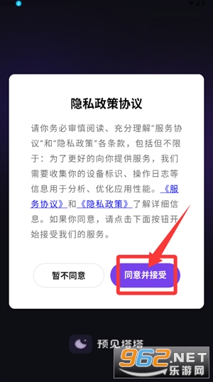 1、在隐私政策协议界面点击同意并接受,完成条款确认操作。