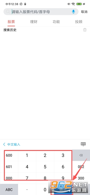 3、在搜索页输入股票代码或首字母,点击确定查找。