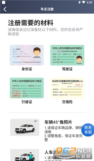 4、准备注册需要的材料,包含有身份证、驾驶证、行驶证、交强险、车辆照片等;