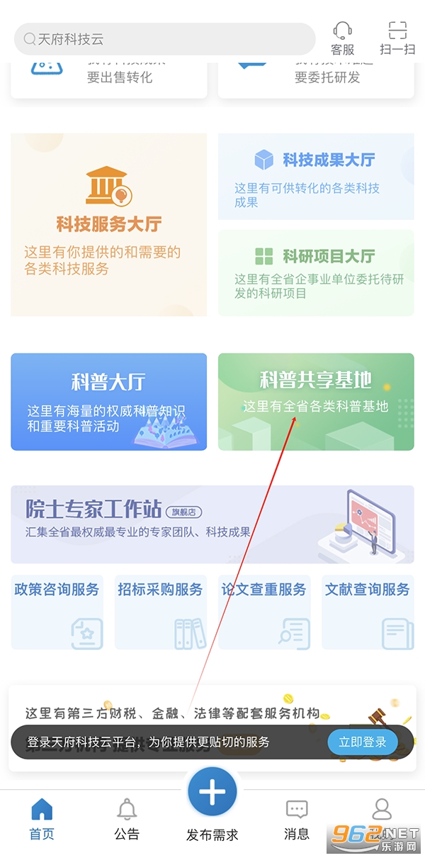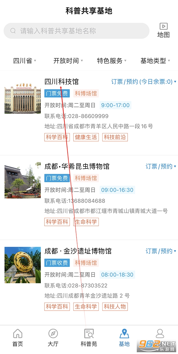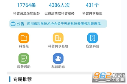 1、打开天府科技云App,点击首页“科普共享基地”;