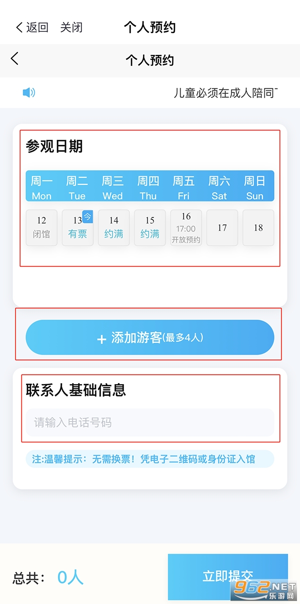 6、选择参观日期,添加游客,填写联系人基础信息后提交即可。